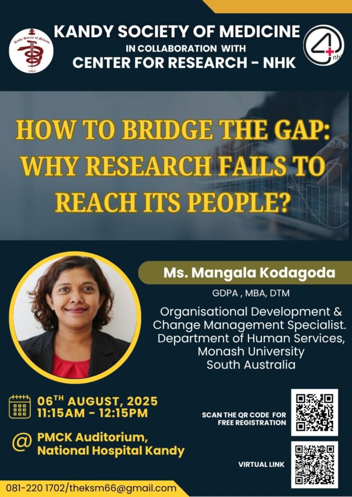 How to bridge the gap: Why research fails to reach its people? 06 Aug π’ Topic – How to bridge the gap: Why research fails to reach its people?π Date: 06th August 2025, 11.15 AMπ Venue: PMCK Auditorium, National Hospital Kandyβ Registration link https://forms.gle/HK85vNK48gF7b56N6π·Join Zoom Meetinghttps://us06web.zoom.us/meeting/register/jKJXgzE4TrKeYRWuxMHehw Event Participants